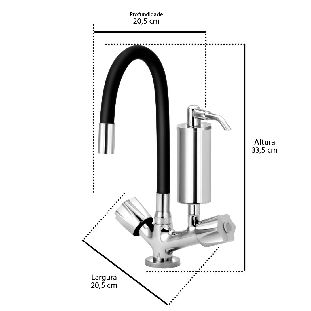 CONTEÚDO DA EMBALAGEM: TORNEIRA GOURMET FLEXÍVEL DE COZINHA MESA COM FILTRO PRETA C50, 1 CANOPLA 1/2, 1 ARRUELA 1/2, 1 APOIO P/ CANOPLA, 1 APOIO P/ ARRUELA, 1 COPO DE METAL C/ REFIL.
